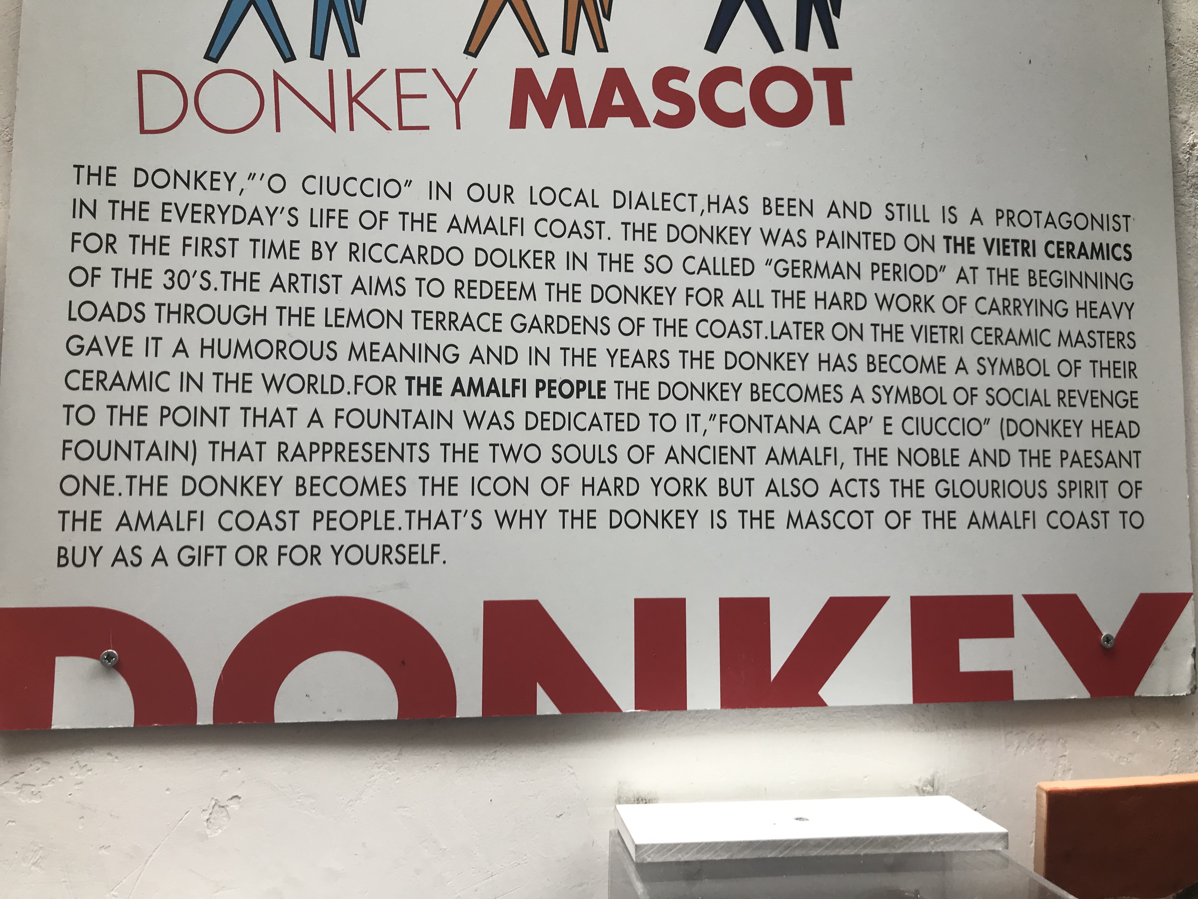Amalfi lemons are represented in just about everything here, from tea towels and kitchen ceramics, to lemon soap and of course limoncello. We were drawn into one quieter ceramics shop, with all its goods branded with hand painted donkeys. We bought 2 espresso mugs for €10 and learnt about the donkey becoming a symbol of Amalfi.