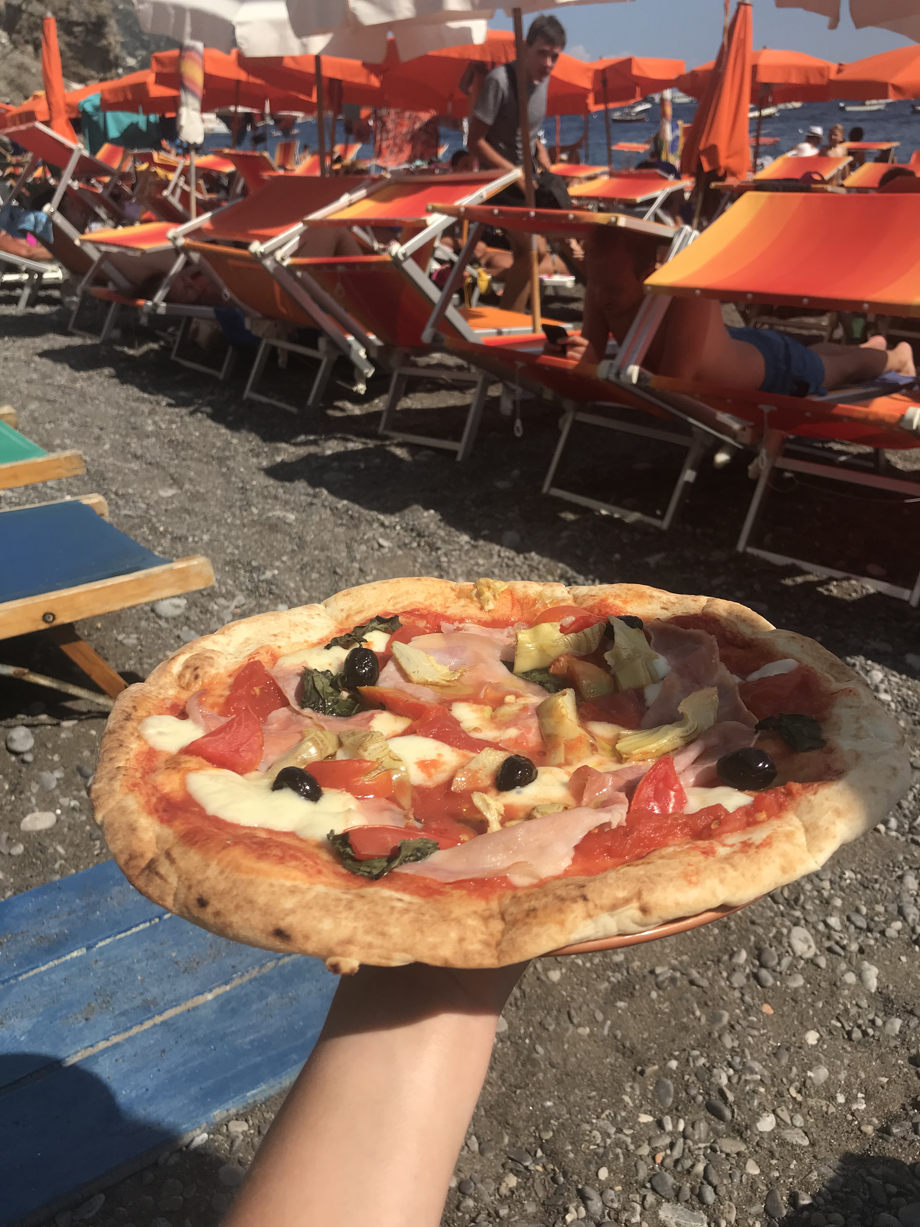 At this time of the year Amalfi is rammed! People everywhere, cars and mopeds flying around the crowds in frustration and a traffic officer repeatedly blowing on his whistle and trying to keep the peace! If you visit in a August, just expect the chaos and you’ll be fine. We headed straight to Marina Grande, the largest beach. Already it was busy and most of the beach bars and rental sun beds were taken. Just when we felt like giving up and dumping our towels on the large pebbles (Amalfi Coast beaches are not synonymous with sand), we walked to the furthest beach bar and got lucky. For €25 we hired two sun loungers and a parasol for as long as we desired, so basically the entire day!