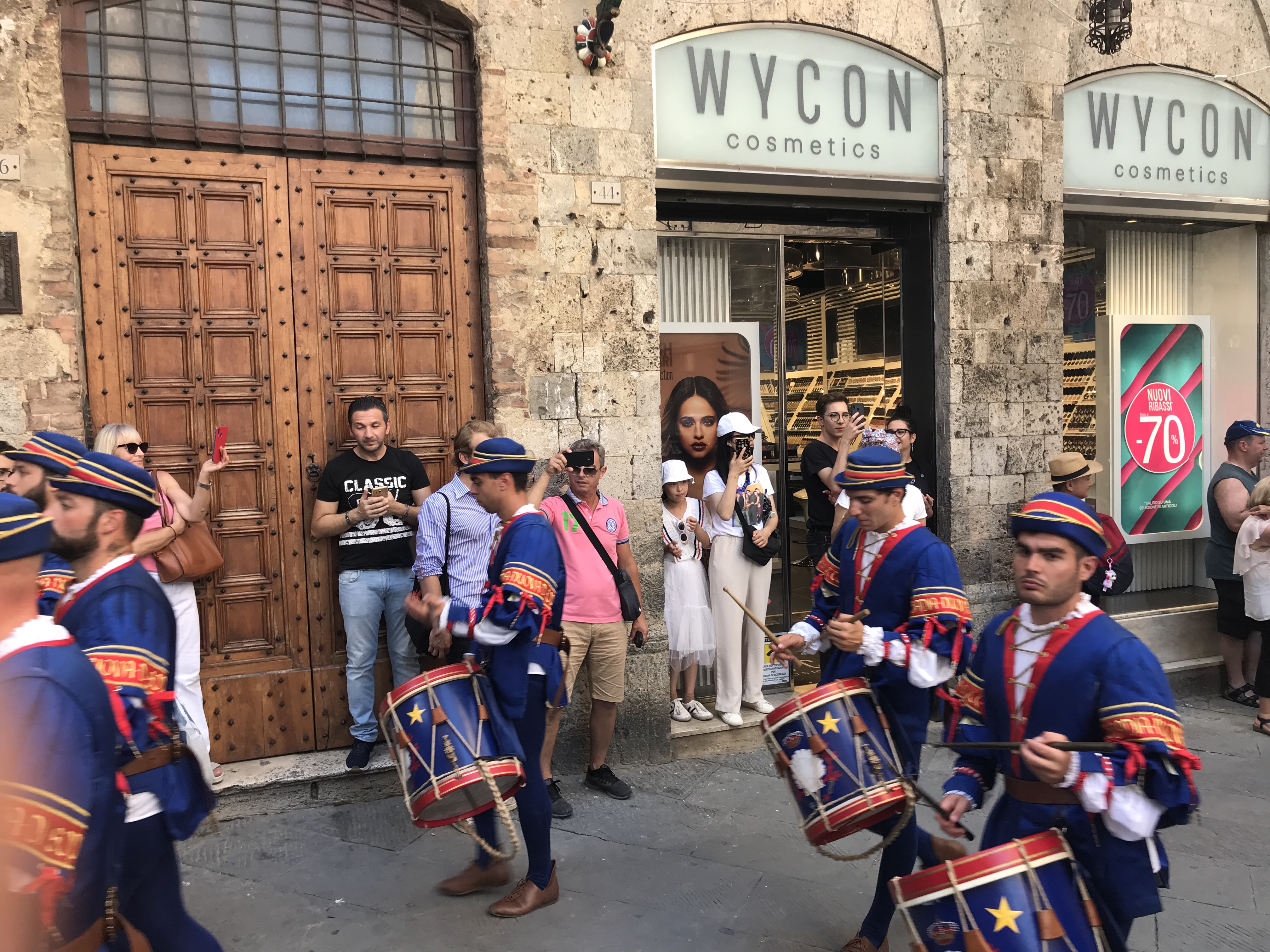 Finally, we caught a drumming procession, marching around the streets, close to the Piazza del Campo, towards the Duomo. Minding our own business and eating yet more ice cream, we could hear the thunderous rumbles of a marching band and had to check it out!