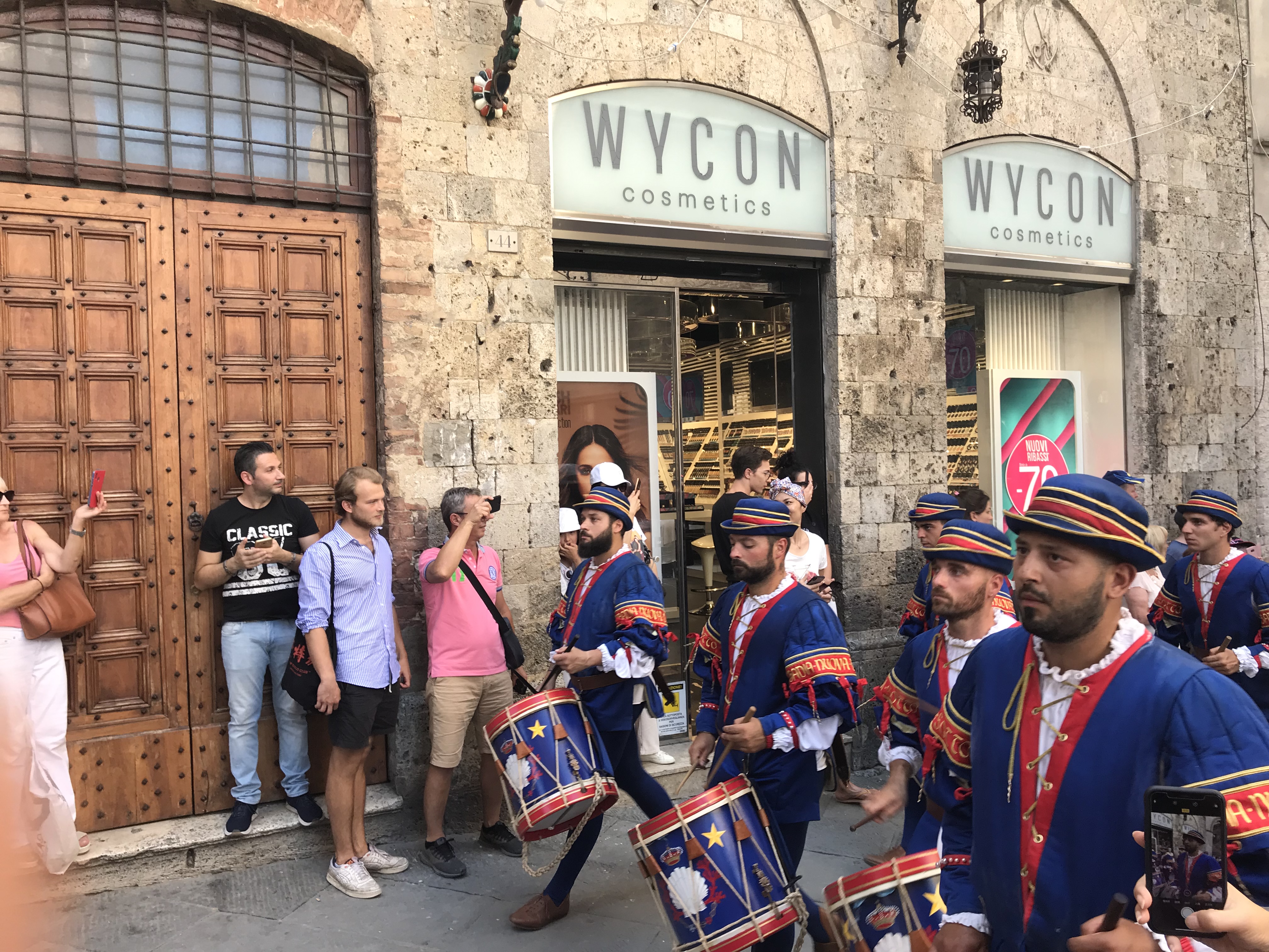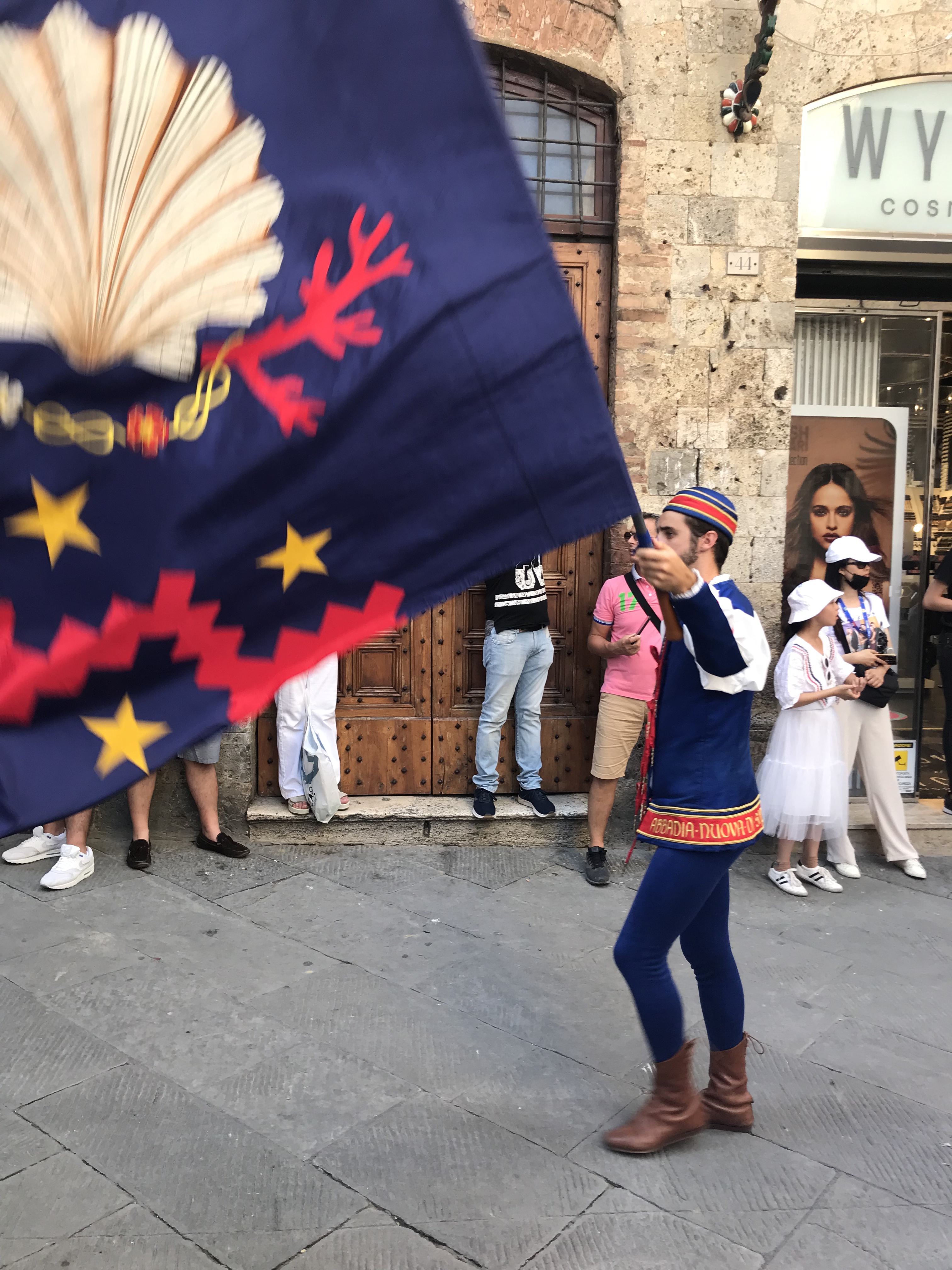 This procession was preparing for the Corteo Storico Procession, which enters the Piazza del Campo prior to the Palio race. The group wear costumes of the Middle Ages, an in age in which Siena was a free city. These garments are faithful reconstructions of 15th century ceremonial garb and are vibrant in their colour and attention to detail. This procession belonged to the Contrada del Nicchio (Seashell) and any local from this particular parish could also be seen representing their area with the flag wrapped proudly around their shoulders. When we asked an Italian official inside the Piazza del Campo who the drummers were, she replied “my Contrada, Contrada del Nicchio, the best one!!” It is clear that fierce patriotism and a strong sense of belonging runs through the heart of the Sienese people.