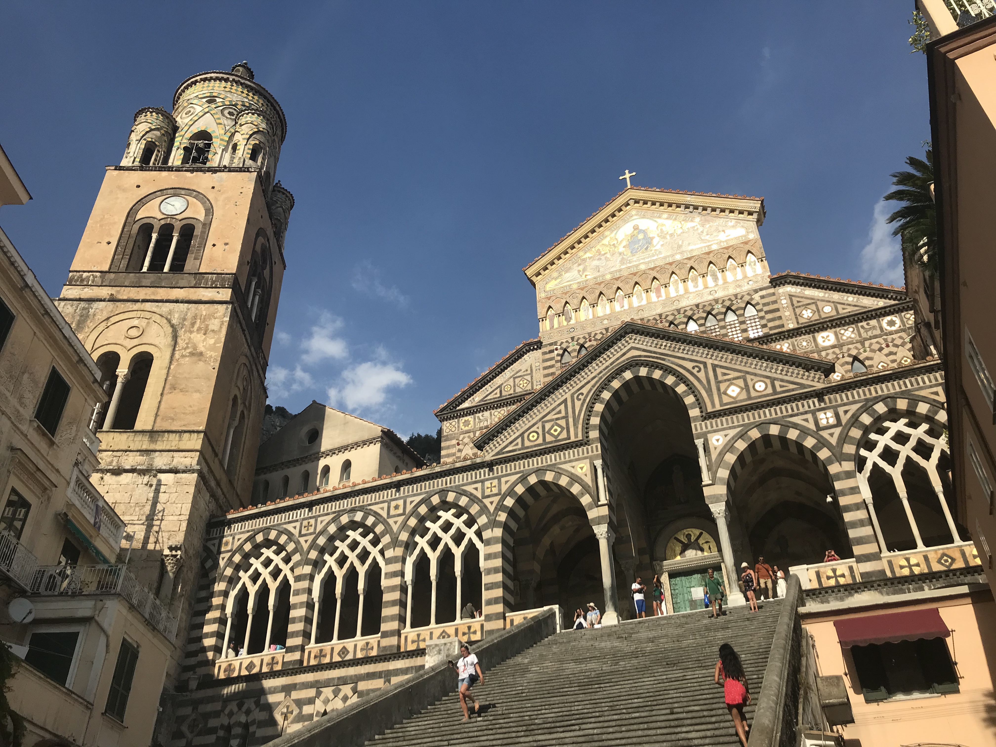 When the sun started to creep behind the buildings behind us, we packed up and had a fleeting wander around the streets of Amalfi. Admittedly we didn’t enjoy our window-shopping; masses of tourists and windy, narrow streets don’t bode well for a relaxing time. Their main church however, is rather worth a look at and can be seen from the ferry when entering Amalfi. Here everything towers over the seafront and as you hop from one beach to another on the Amalfi Coast, each coastal summit promises to deliver spectacular views.