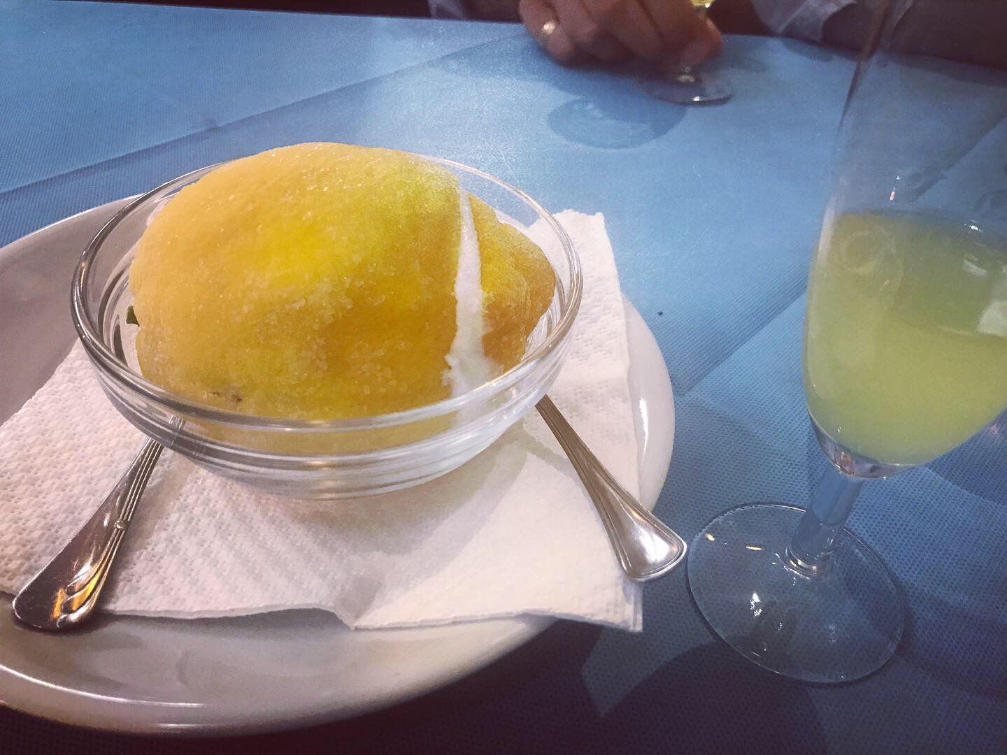 Unperturbed by our already full stomachs, we delved into desserts and shared a lemon sorbet, served up in a frozen Amalfi lemon with limoncello on the side.